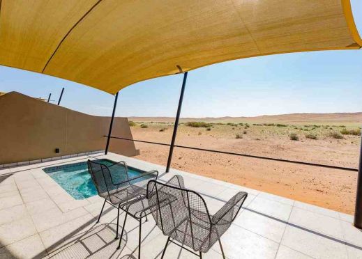 Избрахме уникалния лодж Namib Desert Lodge за нашата нощувка в пустинята Намиб. Открит през 2018 г., това е първият лодж в Гондвана, който е изцяло построена с помощта на торби с пясък вместо тухли. The Desert Grace излъчва блясъка на 50-те с обмислени и красиво подбрани щрихи, отдавайки почит на всичко, което е намибийско. Всяка от стаите разполага със собствен басейн, както и, в допълнение към вътрешните и външни душове с изглед към необятния пейзаж.