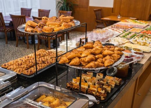 - Закуската е на богат бюфет, включваща пресни плодове, месни и млечни продукти, сладкиши, яйца, зърнени и горещи напитки ;