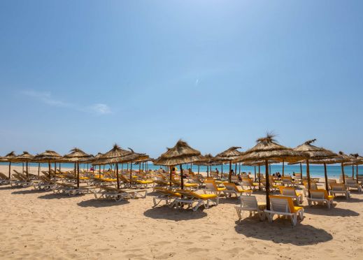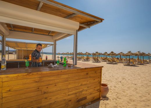 Собствен, пясъчен, на 200 метра от хотела. Чадъри, шезлонги и матраци на плажа и басейна - безплатно. Плажни кърпи - платени и срещу депозит.