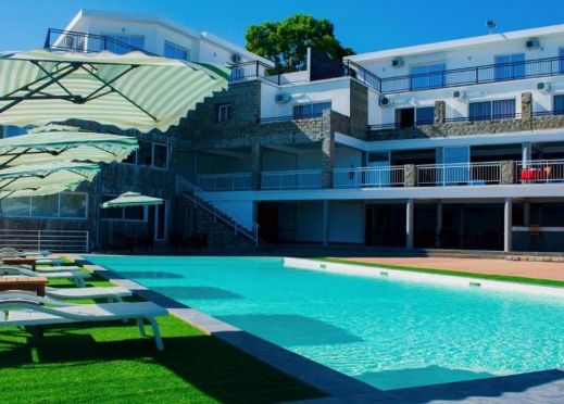 - Открит басейн с шезлонги и чадъри
