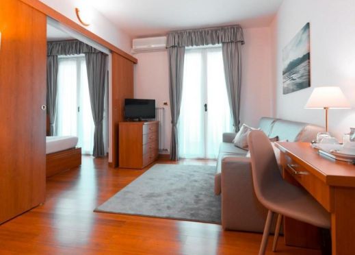 Superior room – 42 кв.м, предлага настаняване до 6 души. Голямата площ е разделена на 2 спални, едната с двойно легло, а другата с двоен разтегателен диван и 1 всекидневна зона с разтегателен диван с две разтегателни легла.