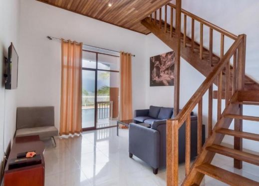 Дуплекс стая с изглед към басейна – 80 м2, максимално настаняване 2 възрастни: голяма спалня, кът за сядане, кухненски бокс снабден с микровълнова фурна, електрическа кана, частен басейн и балкон.