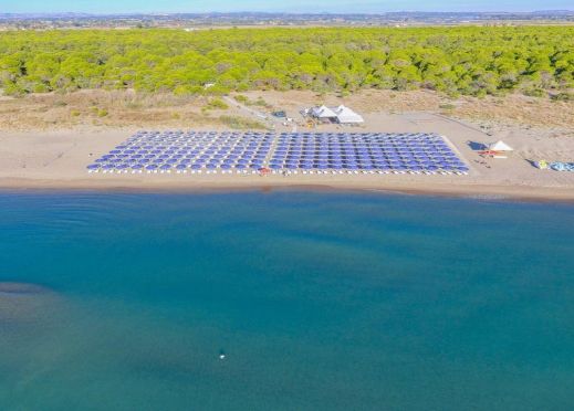 Намира се на 500 метра от хотела и може да бъде достигнат по пътеки през уникална красива пиниева гора, където ще се насладите на девствената природа на Йонийско море. Наличен е и трансфер до плажа. На стая се полагат 1 чадър и 2 шезлонга. Пясъчен плаж, ситен пясък, пясъчно дъно.