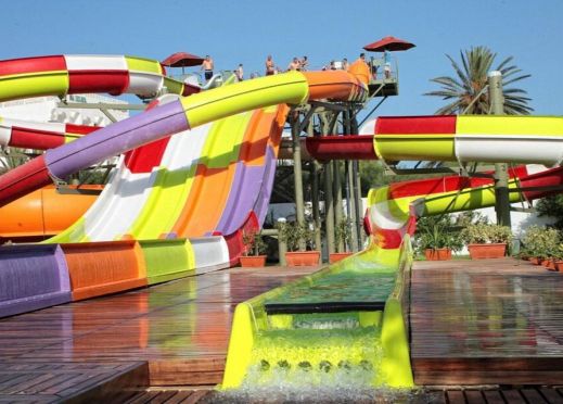 All Inclusive, няколко басейна, собствен аквапарк с водни пързалки, богата анимация, спортни терени и директен достъп до плажа. Хотелът е подходящ за семейства, особено с деца.