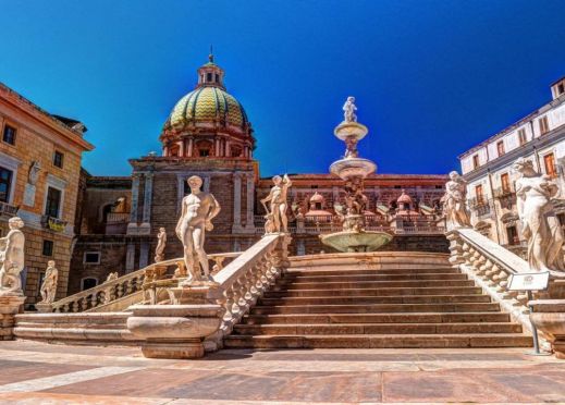 Туристическа програма с местен екскурзовод в столицата на Сицилия, гр. Палермо. В архитектурата на Палермо се смесват всички стилове, отразяващи заплетената и богата история на града. Това е единственото място в света, където са оставили белег всички основни Средиземноморски цивилизации – от финикийците, римляните, арабите и норманите, испанците и французите. Сърцето на Палермо е белязано от бароковото кръстовище „Куатро Канти”, непосредсвено до него се намира „Пиаца Претория” с „Фонтана на срама”, зад сградата на Общината е разположена църквата „Марторана”, където афрески, византийска мозайка и барок се сливат в хармоничен шедъовър. До „Марторана” се намира църквата „Свети Каталдо” – прекрасен пример за арабо-норманска архитектура.