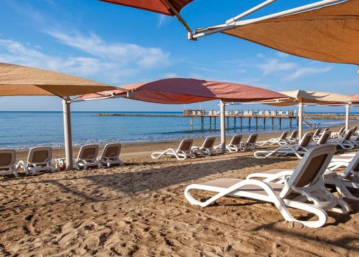 Собствен, пясъченo-чакълен. Чадъри и шезлонги на плажа и при басейна - безплатно. Плажни кърпи - безплатно.