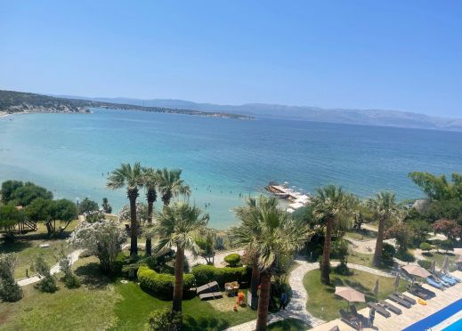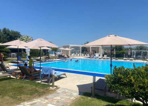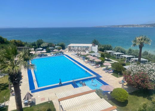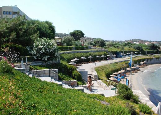 Плаж: дължина на плажната ивица 150 м. Разпределен на 3 нива – първите две нива са с фин пясък, а третото ниво е тревна площ . Морското дъно е с фин пясък плавно полегато. Плажът е удостоен със сертификат „Син флаг“. Има и платформа. Чадъри, шезлонги и матраци на плажа и при басейна- безплатно. Плажни кърпи - безплатно.
