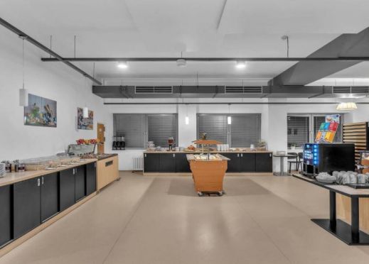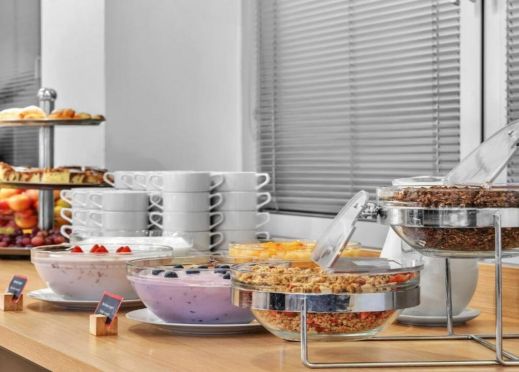 Хотелът разполага със светла зала за закуска, където се предлага континентална закуска на блок-маса – хляб, масло, конфитюр, зърнени храни, колбаси, сирена, плодове, кафе, чай и сокове