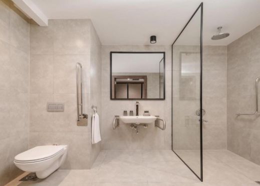 - Голям самостоятелен душ тип тропически дъжд и тоалетна