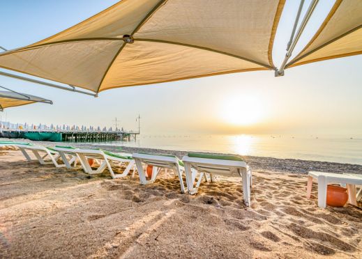 Собствен, пясъчно – чакълест. Чадъри, кърпи, шезлонги и матраци на басейна и на плажа – безплатно.