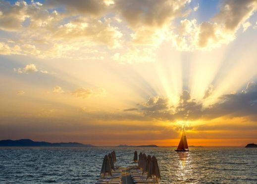 Собствен, пясъчно - чакълест. Чадъри, шезлонги и плажни кърпи (срещу депозит) на плажа и при басейна – безплатно.
