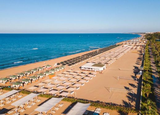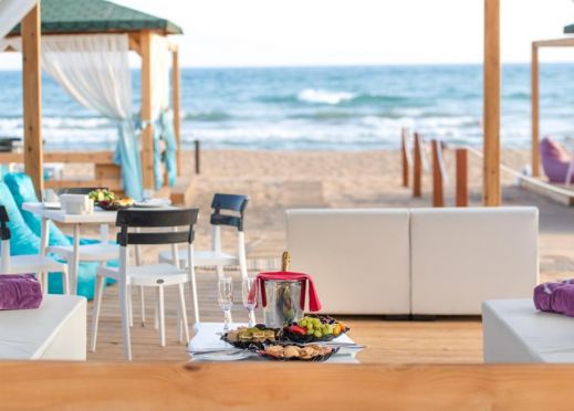 Собствен пясъчен плаж, 2 бара на плажа (единия е винен бар, работи от 03.05 до 31.10) безплатно. На басейна и на плажа: чадъри, шезлонги, матраци – безплатно. Плажни кърпи – безплатно.