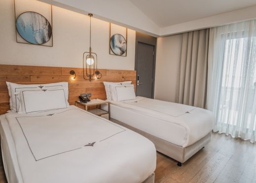 Economy Room (разположени на партерен етаж, без балкон – 26 м2), Superior Room Land View (изглед суша - 30 м2), Superior Room Side Sea View (страничен изглед море - 30 м2), Superior Room Sea View (изглед море - 30 м2), Superior Family Room (2 отделни спални, 2 бани, изглед суша - 42 м2), Superior Corner Room (35 м2), Deluxe Terrace & Jacuzzi Room (с джакузи на терасата, изглед суша/море - 40 м2 + тераса 40 м2), Deluxe Room with Private Garden (разположени в допълнителна едноетажна сграда, с достъп до самостоятелна градина - 80 м2 + градина 38 м2), Suite Room (с джакузи в стаята - 70 м2), Handicap Room (разположена на партерен етаж, без балкон, пригодена за хора с ограничена подвижност – 26 м2).