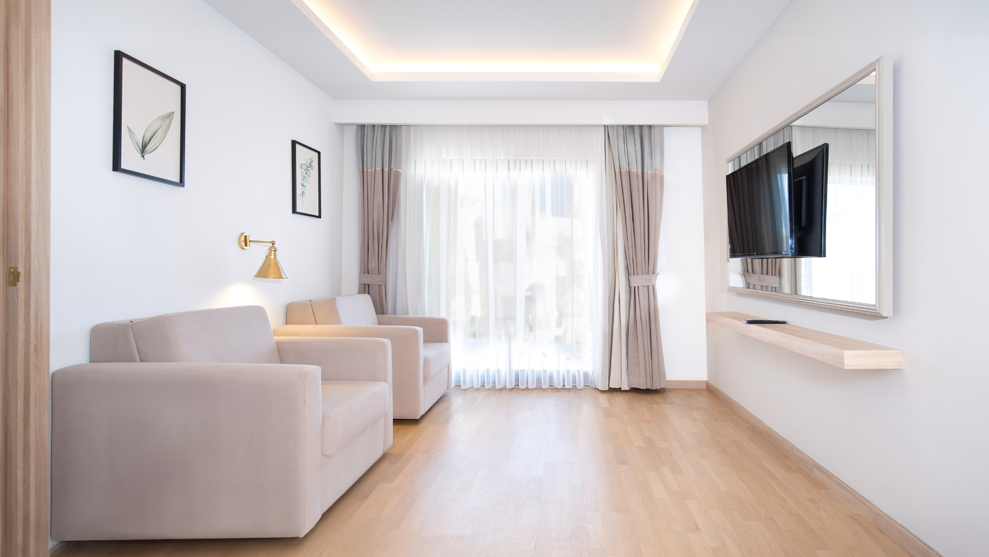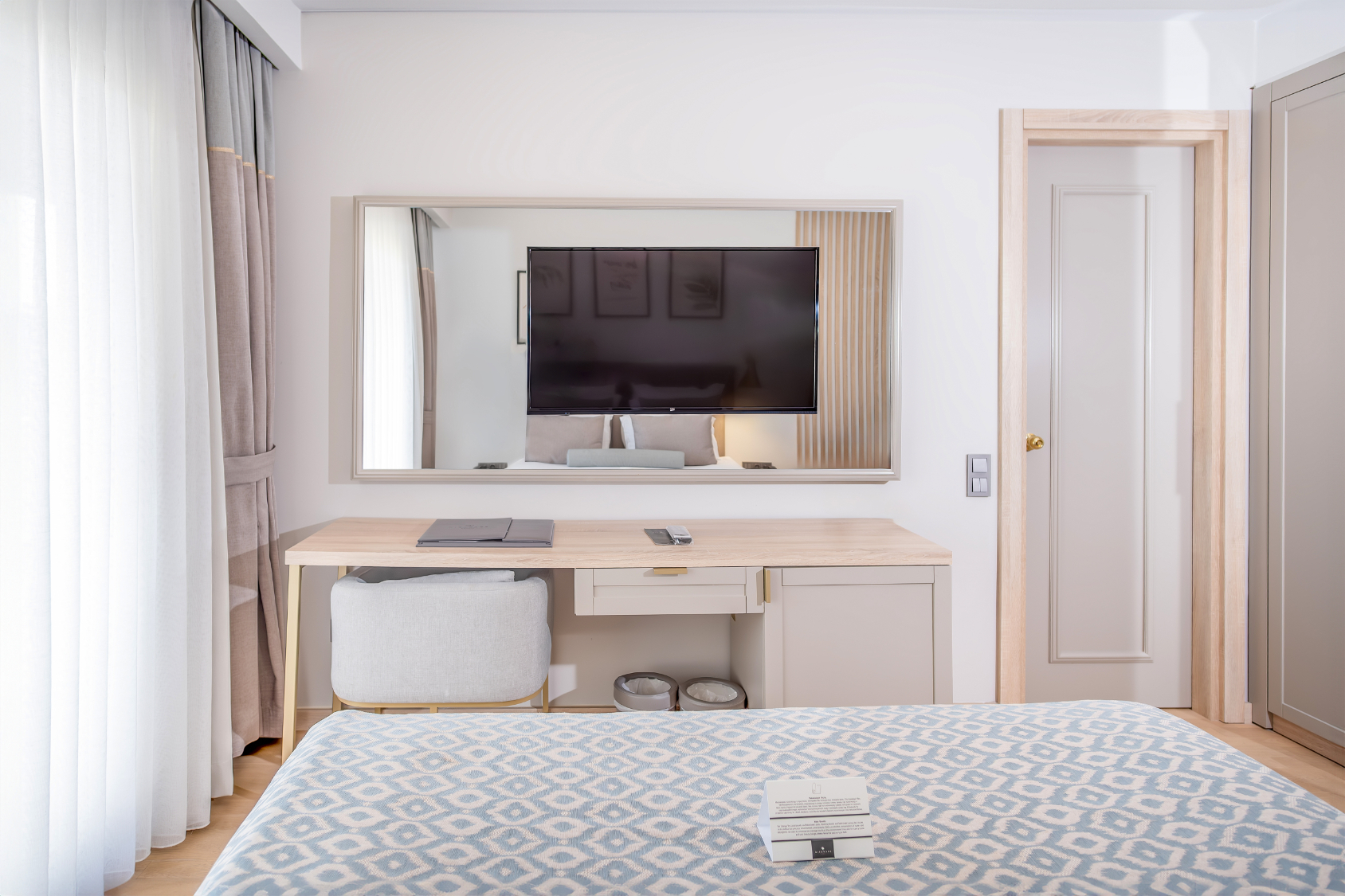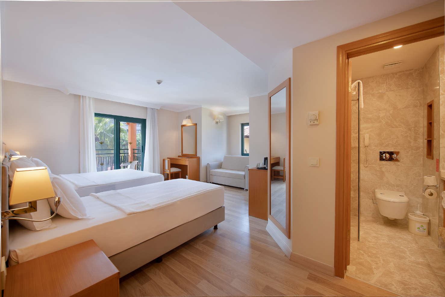 Standard Room Land View (изглед суша - 25 м2), Standard Room Side Sea View (страничен изглед море - 25 м2), Standard Room Sea View (изглед море - 28 м2), Family Garden Building (в допълнителна сграда Garden, 1 спалня с 1 двойно, 1 единично легло и диван, изглед суша – 29 м2), Family Main Building Room (в основната сграда, 1 спалня с двойно и единично легло, 1 дневна с 2 разтегателни фотьойла, 2 бани – 45 м2), Suite Room Land View (1 спалня, 1 дневна, 1 баня, изглед суша - 40 м2), Suite Room Sea View (1 спалня, 1 дневна, 1 баня, изглед море - 50 м2), Suite Room With Jacuzzi And Sauna (1 помещение със спалня и дневна част, разполага с джакузи и собствена сауна, изглед море – 75 м2 и балкон 15 м2), King Suite (2 отделни спални, 1 дневна, изглед море – 75 м2), Handicap Room (пригодена за хора с ограничена подвижност – 28 м2).
