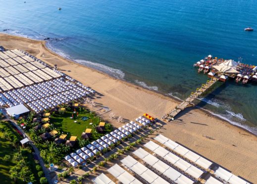 Собствен пясъчен плаж с дължина от 400 м. Плажът се намира на около 300 м от хотела, като може да се използва безплатен шатъл. Eдин от най-хубавите плажове в Анталия. Чадъри, шезлонги и плажни кърпи на плажа и при басейна - безплатно. Бар на плажа - безплатно.