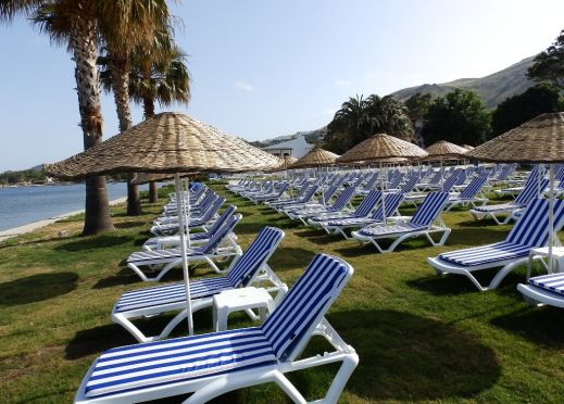 Собствен, пясъчно - чакълест. Чадъри, шезлонги на плажа и при басейна - безплатно.