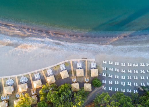 Собствен, пясъчен с камъчета, с дължина 220 м. Чдъри, шезлонги и кърпи – безплатно. Гостите имат възможността да наемат кабана на плажа между 10:00-18:00 (срещу заплащане).