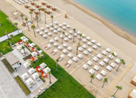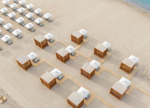 Собствен, пясъчно-чакълест. Чадъри, шезлонги и плажни кърпи на плажа и при басейна - безплатно.