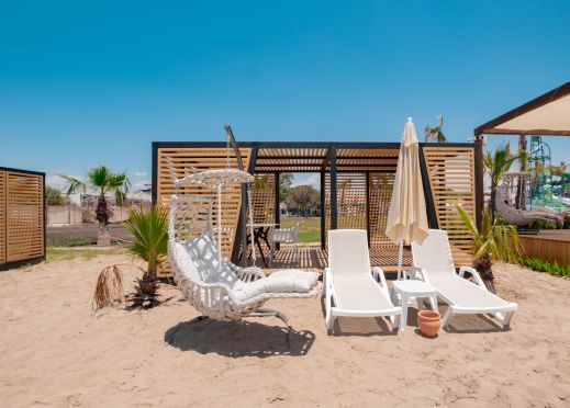 Собствен, пясъчно - чакълест. Чадъри, шезлонги и плажни кърпи на плажа и при басейна – безплатно.