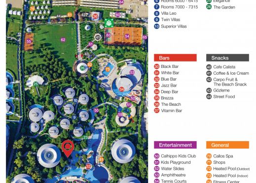 Основен ресторант, 6 а - ла - карт ресторанта (с предварителна резервация), 8 бара, VIP ресторант, дискотека, 4 открити и 2 закрит басейна, 4 водни пързалки, магазини, Спа център, конферентни зали, паркинг.